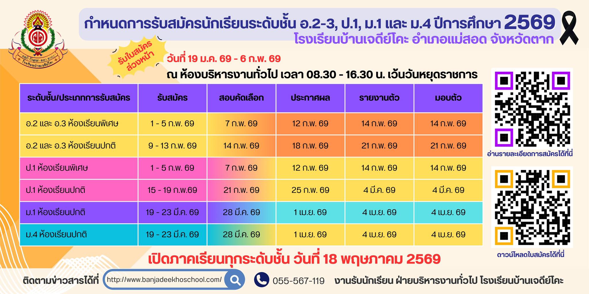( 02 ก.พ. 69 ) - ประกาศปฏิทินการรับสมัครนักเรียน ปีการศึกษา 2569